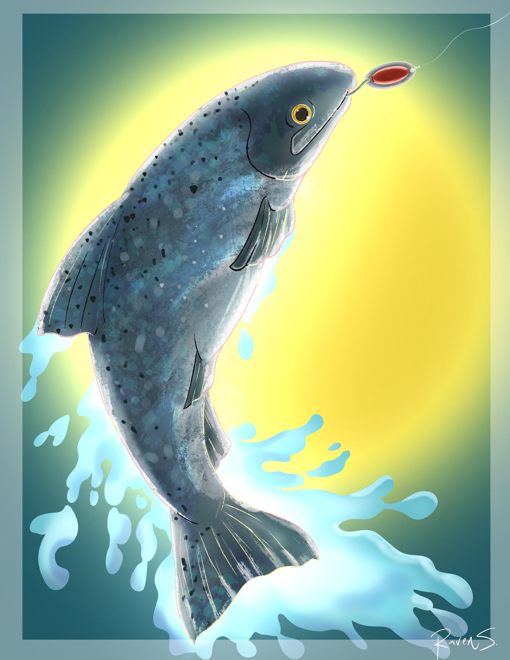 One of my first illustrations that I've printed. Fish a huge deal to me and a big part of my culture. Here is of a Silver Salmon being caught. Available as a 11" x 14" light card stock print.