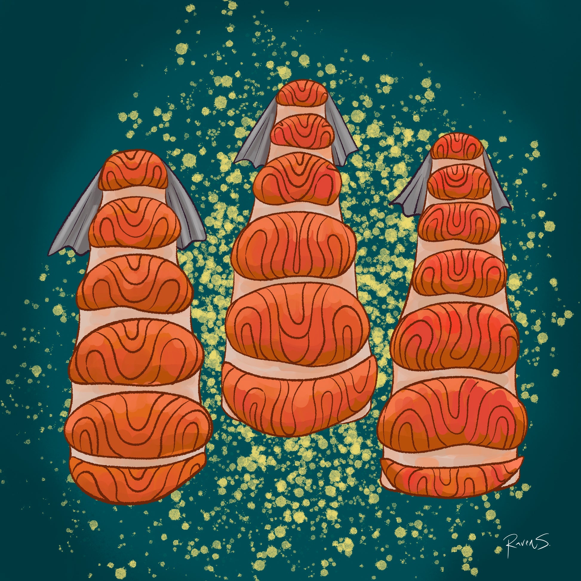 A graphic illustration of a style of fish cut (gabunglaqs). A commonly used cut across Alaska that varies slightly from region to region. Available as a 10"x 10" on light card stock.